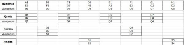 A1 est le vainqueur de la poule 1, E2 est le 2ème de la poule E. Le gagnant du huitième de finale entre A1 et E2 sera nommé U1 et affrontera U2 en quart de finale et ainsi de suite.