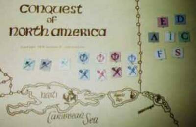 La carte et le livret de règles sont montrés ci-dessous, ainsi qu’un gros plan des pions. Bien qu’il soit un peu difficile à distinguer, les trois pions à gauche montrent un tomahawk et une lance croisés, et représentent l’équivalent d’armées pour les confédérations indiennes ; les Indiens n’avaient pas de flottes. Les huit pions au centre sont 4 avec un sabre et un fusil croisés (les « armées » des colons européens) et 4 avec des ancres (leurs flottes). Le dernier groupe de pions avec des lettres sert à marquer la propriété des centres d’approvisionnement.