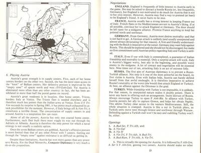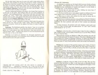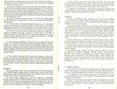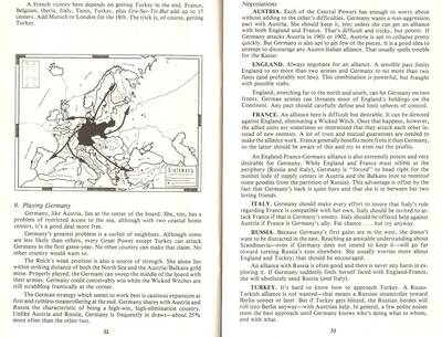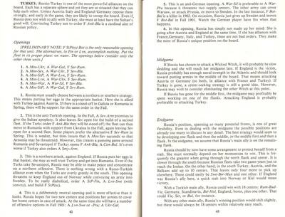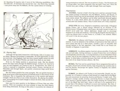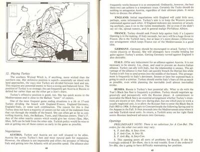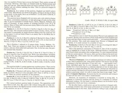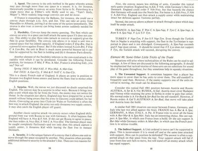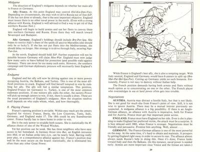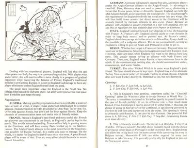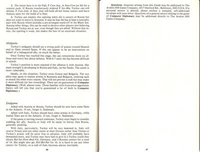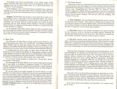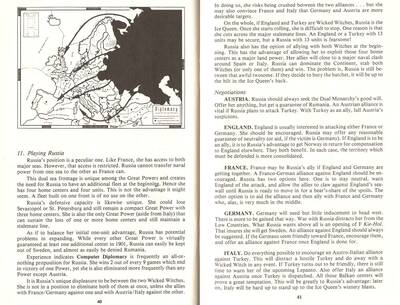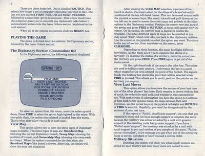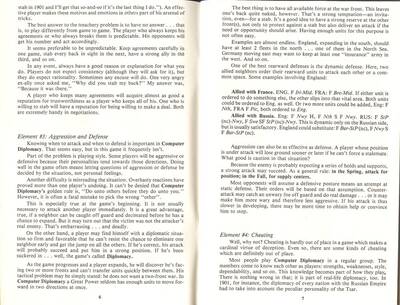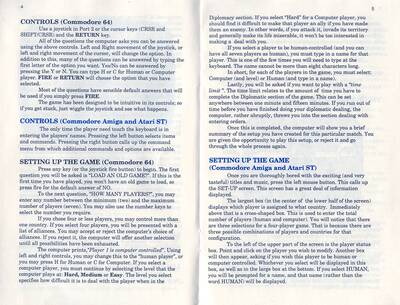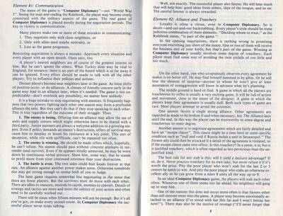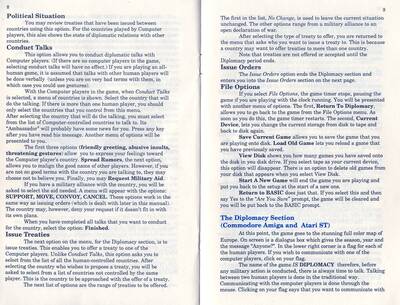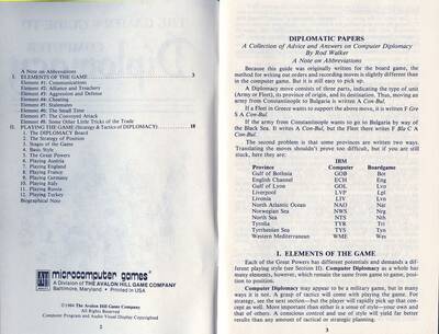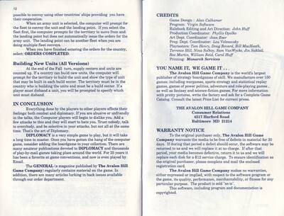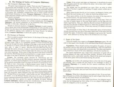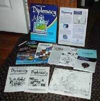 - Cependant, la boîte est différente. Au lieu de ressembler à celle montrée dans la liste de la version DOS de 1984, elle ressemble à une petite version (environ 8 1/2 pouces sur 5 3/4 pouces) de la boîte Deluxe Diplomacy. L'étiquette sur la disquette indique une date de copyright de 1991, mais le manuel d'instructions et le guide du joueur sont toujours protégés par le droit d'auteur de 1984. Si le livre d'instructions n'a pas changé, le logiciel lui-même peut être le même que la version antérieure malgré la date de copyright mise à jour sur l'étiquette. La date de copyright de 1991 elle-même est cependant intéressante. Il est possible que ce jeu ait été vendu après 1992 avec des composants plus anciens, mais s'il a été réellement vendu en 1991, cela signifie qu'il est antérieur à la sortie de Deluxe Diplomacy, et donc que cette conception de boîte a été utilisée pour la version informatique du jeu avant d'être utilisée pour Deluxe Diplomacy