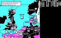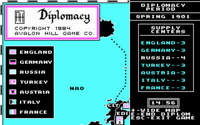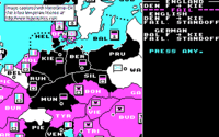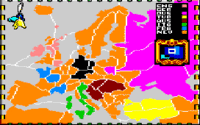 - Je ne sais pas si ce jeu est différent de la version de 1984 du jeu pour le Commodore 64, ou s'il a simplement été licencié et réédité. L'écran de démarrage est le même. La carte est presque la même, sauf que dans la capture d'écran ci-dessous, vous remarquerez que toute province non-locale est considérée comme neutre (selon les couleurs des provinces) alors que dans la capture d'écran de la version de 1984, même les provinces non-locales qui se trouvent dans la « patrie » de chacune des grandes puissances sont colorées de manière non neutre. Cela peut être une différence entre les deux versions, ou il est possible qu'elles soient toutes les deux le même jeu et que les deux images soient de deux vues alternatives différentes qu'un joueur pourrait utiliser pour afficher une carte. Les émulateurs C64 sont disponibles pour les plates-formes Macintosh et PC, donc si vous mettez la main sur une copie de ce jeu, vous pouvez toujours l'essayer juste pour le plaisir.