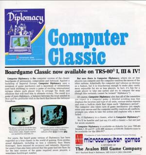 - Ce jeu est un portage de la version DOS de Computer Diplomacy sur les ordinateurs TRS 80 de Tandy. La boîte est presque identique à la boîte DOS, à l'exception d'un encart qui l'identifie comme étant destinée aux ordinateurs Tandy (voir image). Des émulateurs TRS 80 sont disponibles pour les plates-formes Macintosh et PC, donc si vous mettez la main sur une copie de ce jeu, vous pouvez toujours l'essayer juste pour le plaisir.