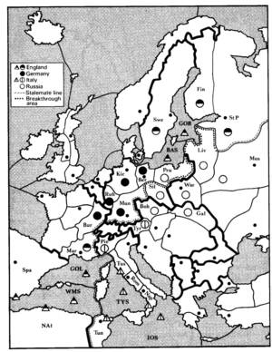 Il existe d'innombrables variantes de la ligne, mais toutes ne sont pas parfaites des deux côtés. Le diagramme 4 montre une position superficiellement très similaire à la précédente, avec la ligne divisant l'échiquier en deux groupes identiques de dix-sept centres. Les puissances occidentales sont désormais aux commandes. Elles peuvent certainement forcer le match nul si elles le souhaitent, avec les mêmes mouvements défensifs que dans l'exemple précédent ; les alliés de l'Est ne peuvent pas briser la ligne. Mais les défenses ne sont pas solides dans l'autre sens : l'A(War) russe peut soutenir la Prusse ou la Livonie, mais pas les deux. Si les alliés occidentaux peuvent deviner correctement, ils peuvent percer, bien qu'un certain nombre de risques soient impliqués, et une fois la percée effectuée, il est très difficile pour les alliés de l'Est de se retirer vers la sécurité de la position précédente, car la province critique de Silésie devient vulnérable. De bons joueurs dans la moitié Est de l'échiquier sauveraient probablement le match nul, mais cela pourrait bien être une affaire serrée.