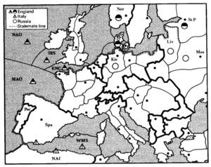 Les lignes de blocage minoritaires ne sont pas si faciles à trouver et nécessitent une grande précision dans leur mise en place pendant le jeu réel. Une ligne peut être obtenue et se produit assez souvent lorsque la Russie et l'Italie se défendent contre l'Angleterre et la France dans une finale à quatre (d'autres permutations de pays peuvent amener la même position, mais c'est la plus courante). Curieusement, j'ai joué l'Italie dans deux parties postales à peu près au même moment (1973-DW et 1973-HB) où cette situation s'est produite : la France et l'Angleterre étaient dans les deux cas enfermées dans une alliance incassable, ce qui a forcé la Russie et moi-même à adopter la même tactique. Dans la deuxième partie, qui s'est déroulée plutôt plus rapidement des deux, nous avons fait un gâchis : je n'étais pas alors certain de ce que devait être la ligne de blocage, et l'inefficacité de mon allié a précipité la fin. Cela m'a rendu plus déterminé que jamais à forcer le match nul en 1973-DW, d'autant plus que la France dans cette partie avait joué contre l'Angleterre dans l'autre, et connaissait donc également le score ! Après plus de quatre ans de jeu réel, les neuf unités italiennes et les quatre unités russes survivantes réussirent à tenir la ligne contre les vingt unités ennemies (nous avions un quatorzième centre, mais nous ne pûmes pas organiser les choses de manière à le construire). La position des unités défensives était celle indiquée sur le schéma 6.