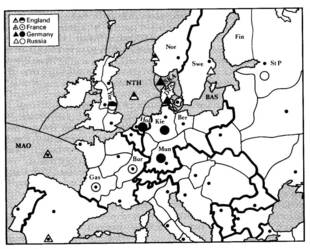 Rappelez-vous que l'Angleterre a ce que vous voulez : la mer du Nord et la position de force qu'elle contrôle. Si vous pouvez prendre la mer du Nord sans craindre de la perdre à nouveau, vous l'avez. Il n'est pas exagéré de dire que le contrôle de cet espace maritime est l'objectif le plus important de l'Allemagne, et l'atteindre est à mi-chemin de la victoire. Mon jeu préféré, 1974-N, en fournit un bon exemple ; la position avant les mouvements de l'automne 1902 est illustrée dans le diagramme 8. L'Angleterre a jusqu'à présent été victime d'une malchance (soigneusement organisée), mais les choses semblent enfin tourner en sa faveur ; elle a réussi à prendre la Norvège, et son allié allemand avance délibérément contre la Suède occupée par la Russie, tout en empêchant la France d'entrer en Belgique. Avec la promesse de la Belgique pour elle, à condition seulement qu'elle la prenne avec une flotte, l'Angleterre espère obtenir deux renforts pour compenser la déception de n'en avoir obtenu aucun en 1901. L'Allemagne a promis d'attaquer également la Suède, de sorte que l'attaque russe probable contre la Norvège verra son soutien réduit.