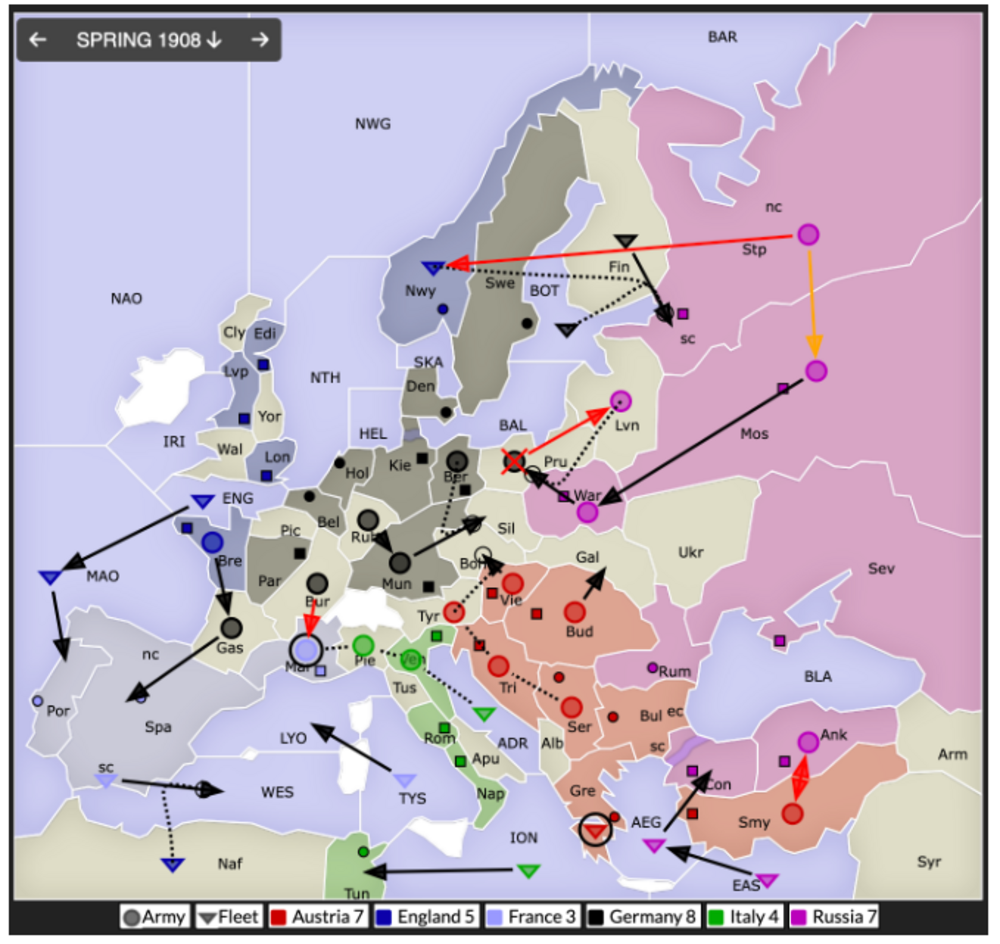 J'ai abordé la deuxième ronde à la troisième place et j'ai tiré l'Allemagne. Au printemps 2002, j'ai décidé de travailler avec Johnny en Angleterre au lieu de rejoindre une sealion contre lui. La France s’est bien défendue mais je n’ai pas subi la pression de l’Est et au printemps 1908 (Figure 2), les choses allaient plutôt bien. J’ai pris StP, je suis entré en Espagne grâce à un accord avec la France et j’ai poussé Munich vers la Silésie. Attendez, pourquoi ai-je poussé Munich en Silésie ?