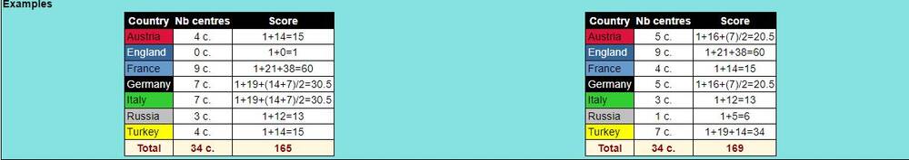 Il partage avec le C-diplo l'idée d'une forte hiérarchisation des résultats, une première place vaux mieux qu'une seconde. Mais elle est tempéré par l'attribution d'objectif territoriaux non relatif pour les résultats en dehors du podium. Quand vous êtes petit vous devez améliorer votre territoire, quand vous etes gros c'est la place qui est vraiment importante.