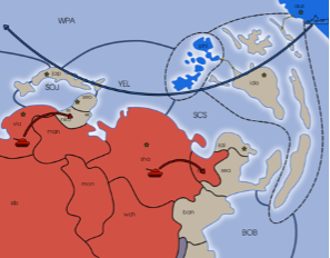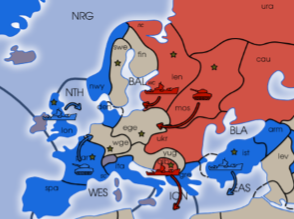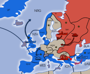 Il s’agit de la variante d’ouverture la plus utilisée de l’URSS, car elle comporte le moins de risques. La flotte de la côte sud de Léningrad est utilisée pour tenter de prendre la Suède. La flotte albanaise se déplace vers la Grèce afin de rebondir sur la flotte de l'OTAN qui tente d'y arriver également, suivie d'un déplacement vers la mer Ionienne à l'automne. L'armée de Moscou se déplace en Allemagne de l'Est et détient le centre d'approvisionnement pour les constructions. Vladivostok prendra simplement Séoul, qui est le seul centre neutre disponible dans les environs. L'armée de Shanghai se rendra au Bangladesh pour prendre l'Inde, ce qui ouvrira la voie vers l'Iran à l'avenir. La seule flotte des Caraïbes prendra facilement Panama.