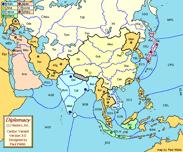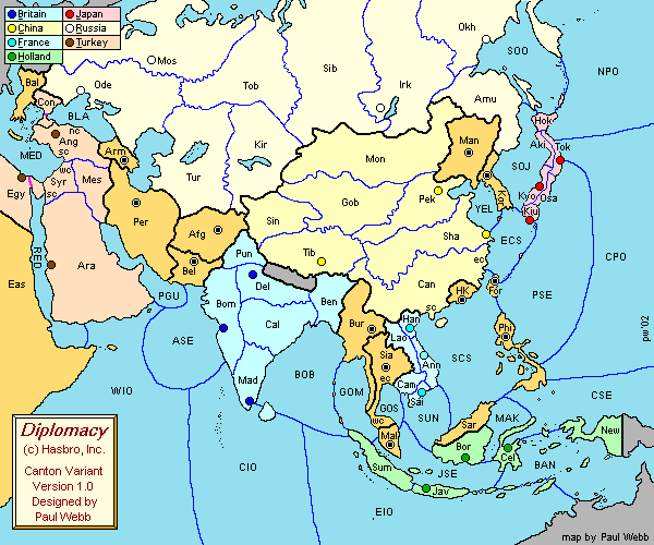 - Canton a commencé avec un principe simple : fusionner le cadre fascinant de l'Asie à l'époque coloniale - lorsque les empires européens se battaient contre les nations autochtones et entre eux pour la grande richesse du plus grand continent de la Terre - avec l'élégante simplicité montrée dans le Classique d'Allan Calhamer. Compte tenu des faiblesses majeures de la diplomatie coloniale (règles supplémentaires complexes, densité de provinces inutilement élevée, manque extrême d'équilibre, etc.), Paul Webb a tenté de fusionner de grands espaces inutiles et de donner un sentiment plus intime à l'Asie tout en utilisant les sept pouvoirs originaux du colonialisme : Grande-Bretagne, Turquie, Chine, Russie, Japon, France et Hollande.