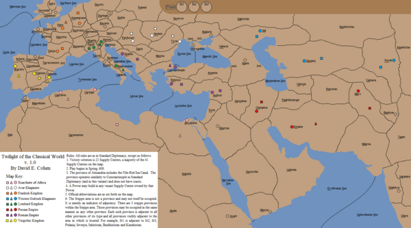 Crepuscule du monde classique (Twilight of the classical world in english ) est une variante a 8 joueurs se deroulant apres la chute de l'empire romain d'occident au debut du septieme siecle